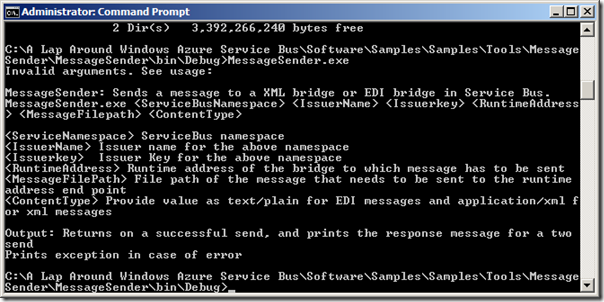 Now that the solution has been deployed you want to test it.You first need to locate the MessageSender project in \Tools\MessageSender folder under the base directory of samples. Samples can be download from same location as SDK and ServiceBusConnect. You need to open this project and build it. Then you use the resulting MessageSender command line executable to send messages to the deployed bridge end points. This tool accepts command line parameter, and the sequence and usage of those parameters is given below: